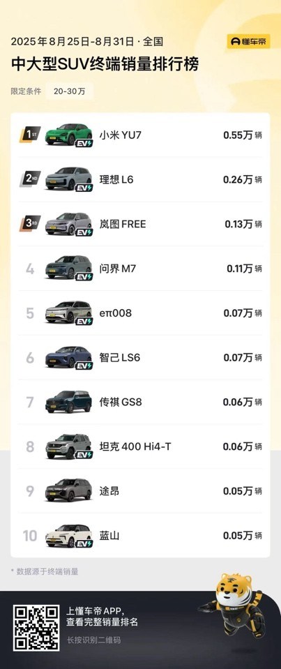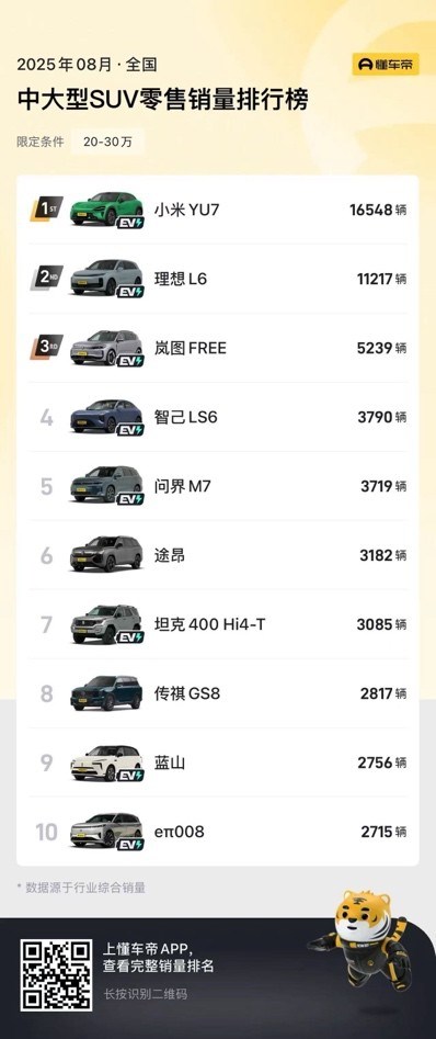 【2025年9月9日,武漢】2025年8月中國新能源SUV市場再掀波瀾,高能榜單重磅出爐,20-30萬元中大型SUV賽道正式迎來“小理華”新格局。嵐圖FREE+以 5,239輛 的月銷成績,強(qiáng)勢躋身細(xì)分市場 Top3,與小米YU7、理想L6并肩而立,形成“小米、理想、嵐圖(華系代表)”三強(qiáng)鼎立的競爭新態(tài)勢。