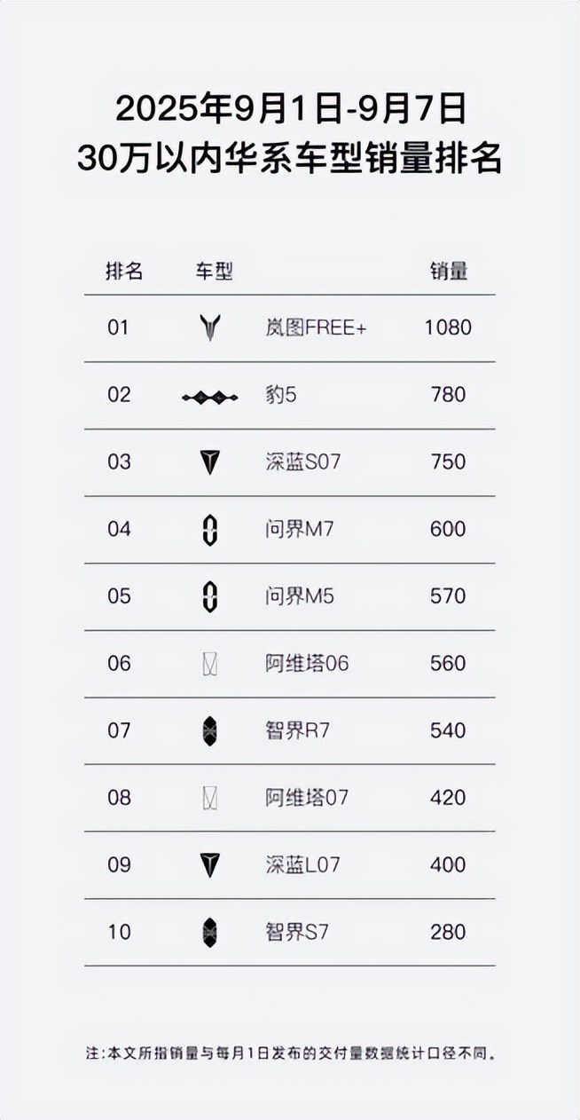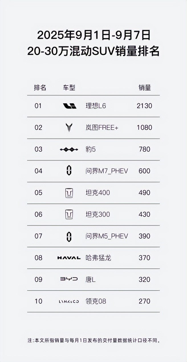 尤其在8月最后一周(8月25日-31日),嵐圖FREE+單周銷量再攀高峰,達(dá)到 0.13萬輛,緊隨理想L6與小米YU7之后,牢牢鎖定20-30萬元中大型SUV零售榜 Top3。金秋九月,嵐圖FREE+延續(xù)強(qiáng)勢,以1080臺佳績再奪“30萬內(nèi)華系車型銷冠”,穩(wěn)居20-30萬混動SUV市場Top2,展現(xiàn)出強(qiáng)勁的爆款勢能與持續(xù)的市場滲透力。